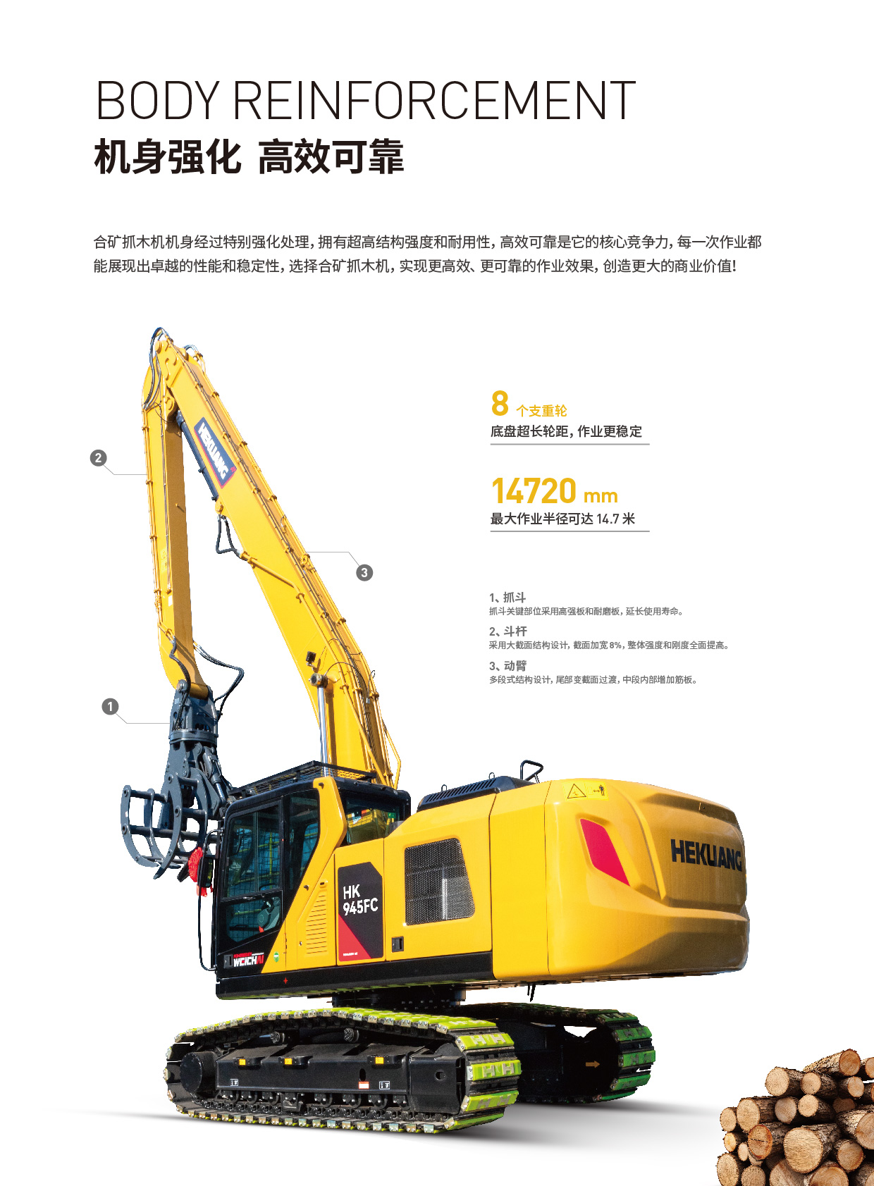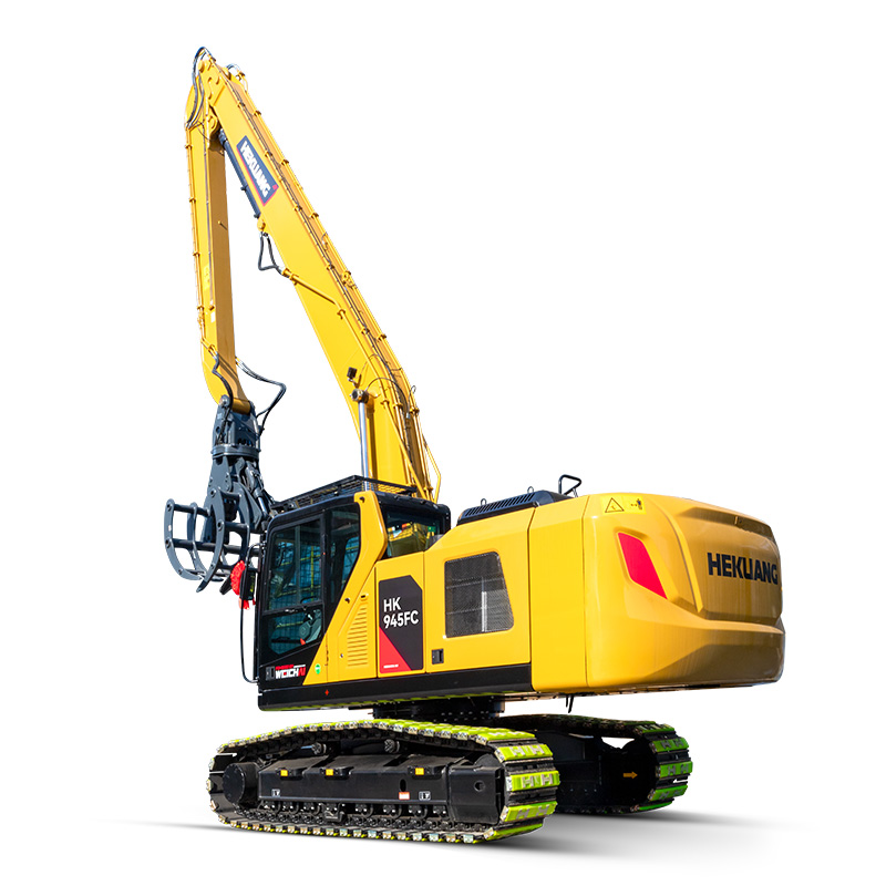 HK945FC抓木機的機身經(jīng)過特別強化處理,具備超高的結構強度和耐用性。其底盤設計超長輪距,配備了8個支重輪,確保了作業(yè)過程中的穩(wěn)定性和可靠性。抓斗、斗桿和動臂等關鍵部位采用了高強板和耐磨板,以及大截面結構設計,全面提升了整體強度和剛度,延長了使用壽命。