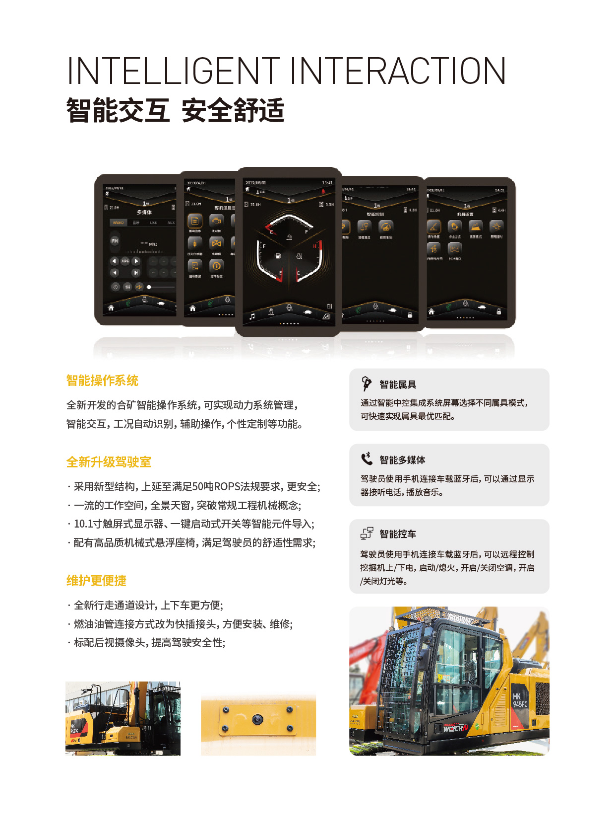 為了方便用戶進行維護和保養(yǎng),HK945FC在設計上充分考慮了便捷性。全新行走通道設計使得上下車更為方便;燃油油管連接方式改為快插接頭,便于安裝和維修;標配后視攝像頭則提高了駕駛的安全性。